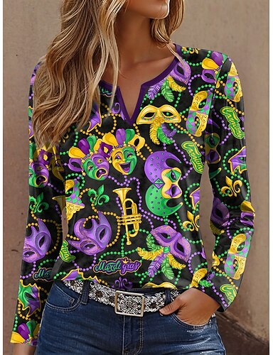 Camiseta Feminina de Carnaval Gráfica Geométrica Vintage Estilosa Moderna de Manga Longa Gola Notch Tops Regulares Impressão Diária de Fim de Semana Roxo Primavera Inverno