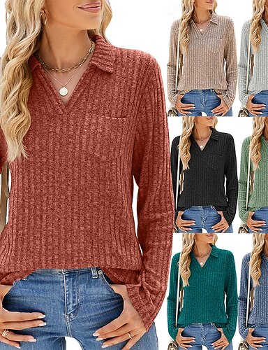 Mulheres Blusa Bolsos Côr Sólida à moda Casual Manga Longa Decote V Tops regulares Diário Verde Sage Preto Vermelho Verde Cinzento Primavera Outono Inverno