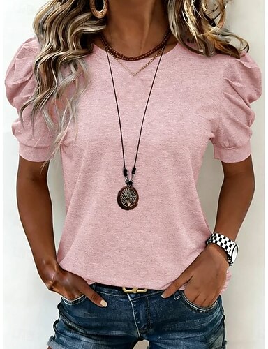 Mulheres Camiseta T-shirt Franzido Tecido Moda à moda Clássico Manga Curta Gola Redonda Tops regulares Diário Para Noite Final de semana Azul Rosa Vinho Verde Cinzento Escuro Verão Primavera