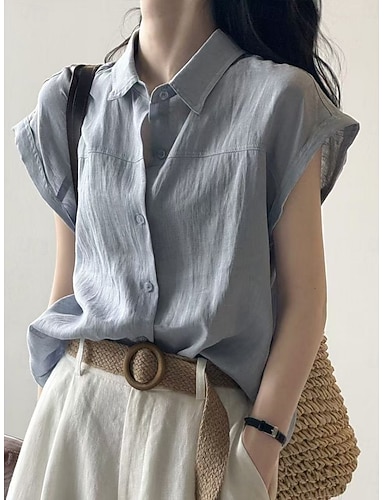 Mulheres Blusa Camisa de linho sintético Botões Côr Sólida à moda Casual Manga Curta Colarinho de Camisa Tops regulares Diário Azul Branco Amarelo Verde Verão Primavera