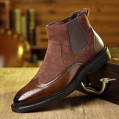 Botas Chelsea masculinas marrons com fivela de metal, botas sociais de couro sintético com cadarço e cano curto para uso profissional, de escritório e formal