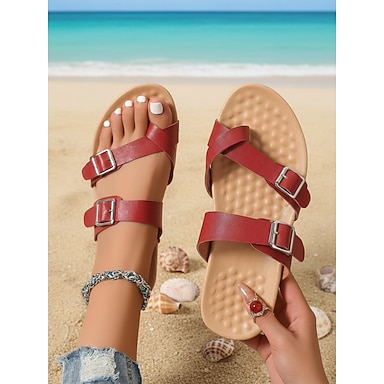 Sandálias femininas vermelhas confortáveis com fivela dupla – palmilha acolchoada, tiras ajustáveis, calçado plano e com bom suporte para caminhadas, viagens, atividades ao ar livre e uso diário.