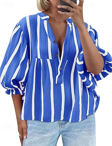 Mulheres Camisa Social Blusa Tops elegantes Franzido Patchwork Botões Tecido Listrado Elegante Vintage senhoras Manga Longa Manga Princesa Decote V Tops regulares Diário Trabalho Feriado Azul Amarelo