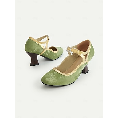 Sapatos femininos estilo mary jane vintage verde e dourado dos anos 1930 com fivela de strass, salto médio confortável, perfeitos para eventos formais e festas com tema retrô