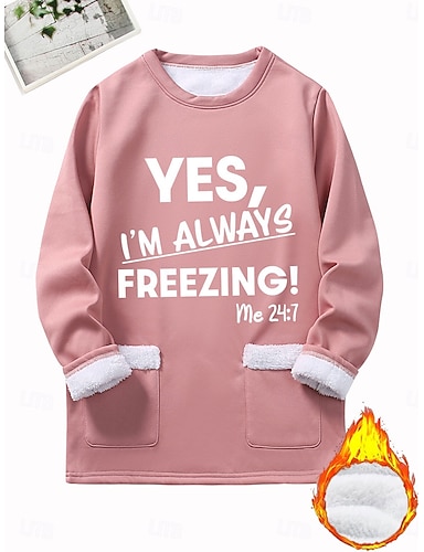 Mulheres Moletom Pullover Bolsos Imprimir Gráfico Letra Quente Moda Casual Manga Longa Gola Redonda Decote Redondo Tops longos Rua Dia a Dia Azul Preto Rosa Escuro Cinzento Outono Inverno
