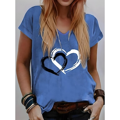 Camiseta feminina de coração de Dia dos Namorados tops básicos regulares manga curta gola em V impressão ajuste regular fim de semana vermelho azul roxo verde cinza