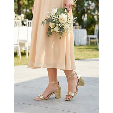 Sandálias femininas douradas com salto bloco, sapatos elegantes para damas de honra em casamentos no jardim, saltos confortáveis para cerimônias ao ar livre.