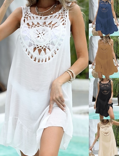 Mulheres Roupa de Banho Cobertura Vestido de Banho roupa de banho Crochê Férias Roupa de Praia Côr Sólida Decote Redondo Manga Curta Fatos de banho