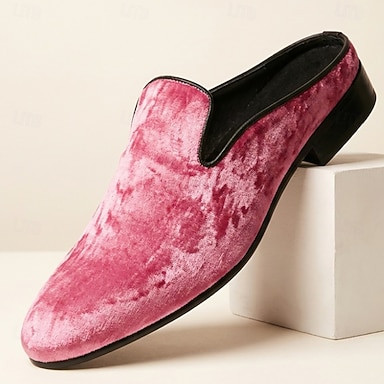 Mocassins mule masculinos de veludo rosa, modelo slip-on, elegantes e sofisticados, perfeitos para casamentos, festas, banquetes, formaturas e eventos noturnos.