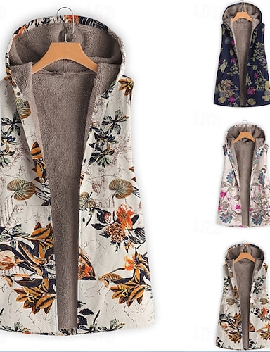 Mulheres Casaco de lã colete de lã Casaco de pelúcia Confortável Respirável Bolsos Imprimir Casual Floral Férias Rua Casual Roupa Diária Abertura Frontal Longo Com Capuz Normal Sem Manga agasalhos