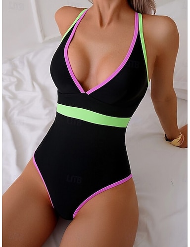 Mulheres Roupa de Banho Biquíni 2 partes Cavado roupa de banho Delgado Frente Única Férias Roupa de Praia Bloco de cor Decote V Sem Manga Fatos de banho