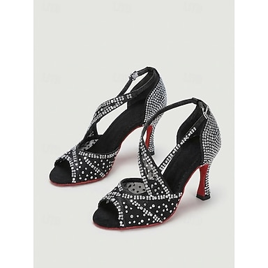 Sapatos de dança latina femininos pretos com strass, modelo aberto com tiras, ideais para salsa, tango e apresentações. &eventos de dança noturnos