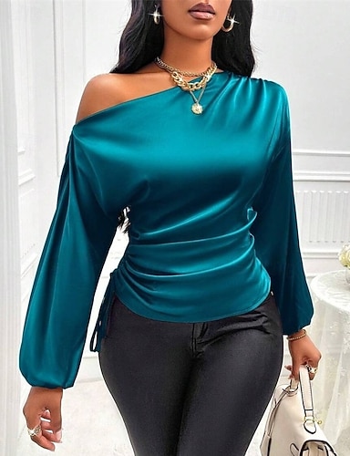 Mulheres Camisa Social Elegant Elegante Top de cetim Assimétrico Tecido Elegante à moda Básico Manga Longa ombro frio Tops regulares Diário Para Noite Azul Preto Marron Verde Verão Primavera Outono