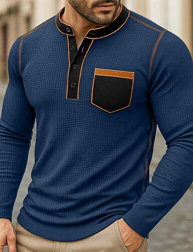 Homens Camisa Waffle Henley Camisetas Manga Longa Henley Verão Outono Inverno Côr Sólida Tecido Moda Designer Moderno Bloco de cor Botões Ao ar livre Casual Diário Preto Azul Marinha Marron Top Tee