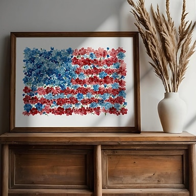 Impressão Rústica Floral da Bandeira Americana - Arte de Parede Patriótica em Aquarela Decoração de Casa de Campo Cottagecore Pintura Botânica Festiva