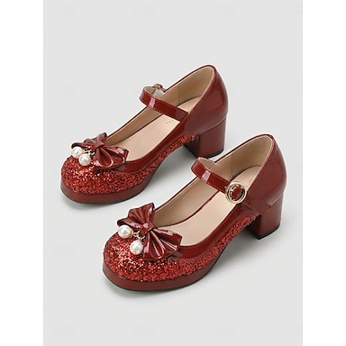 Sapatos Mary Jane vermelhos vintage com glitter, estilo anos 50, para mulheres - scarpins de salto baixo bloco com lantejoulas brilhantes e detalhe de laço de pérola, perfeitos para festas retrô e