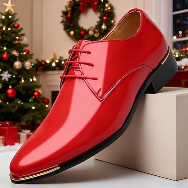 Sapatos oxford masculinos de couro sintético vermelho brilhante – calçados clássicos e confortáveis para jantares de Natal e festas de fim de ano
