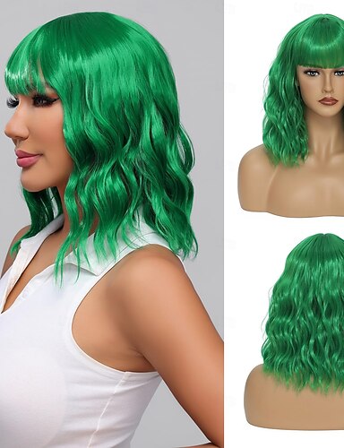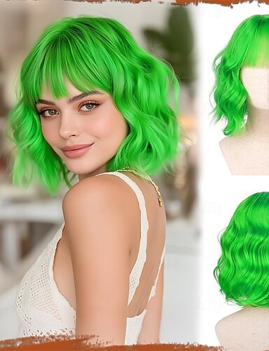 Perucas Verdes Peruca Sintética Lisa Bob Bob com Franja Curta Cabelo Sintético Verde Mulheres Moda Suave
