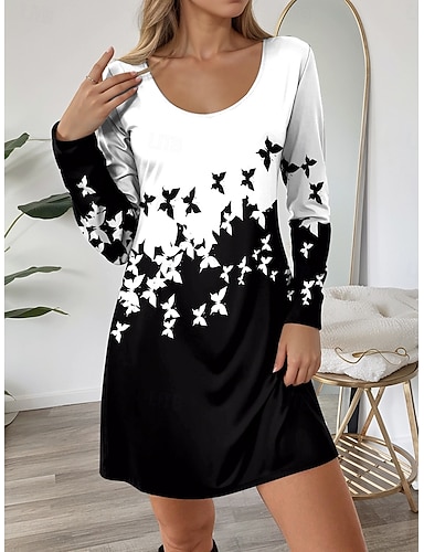 Vestido Mini Feminino Gola Redonda Manga Longa Vestido T Shirt Vestido Tee Vestido A Linha Vestido Casual Diário Ajuste Regular Gráfico Borboleta Branco Rosa Azul Roxo Outono Inverno