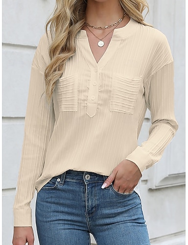 Mulheres Camisa Social Blusa Bolsos Tecido à moda Clássico Moderno Manga Longa Decote V Tops regulares Diário Feriado Para Noite Preto Vinho Verde Tropa Bege Verão Primavera