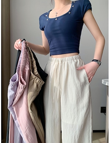Mulheres Calças de linho de algodão Perna larga chinês Calça verão Férias Roupa de rua Casual Comprimento total Cintura Média Tecido Com Cordão Bolsos Confortável Micro-Elástica Diário Ao ar livre Rua