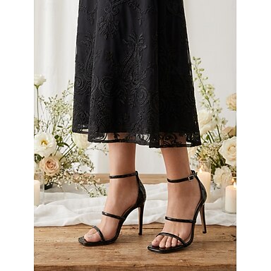 Sandálias femininas pretas de salto agulha com tiras, modelo aberto no tornozelo, elegantes e perfeitas para coquetéis e eventos noturnos. &ocasiões formais