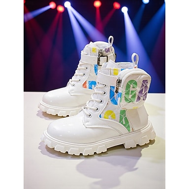 Botas infantis de verniz branco com estampa colorida de logotipo, inspiradas em ídolos pop coreanos. &Detalhe de zíper para look de festa de Ano Novo