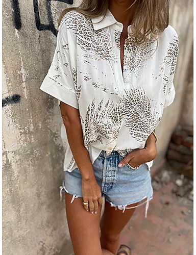 Mulheres Camisa Social Blusa Patchwork Botões Gráfico Férias Vintage à moda Manga Curta Colarinho de Camisa Tops regulares Diário Feriado Para Noite Branco Oliva Verão Primavera
