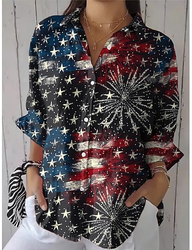 Dia da Independência Americana Mulheres Camisa Social Franzido Gráfico Bandeira Vintage à moda Manga Longa Mangas Evasê Sino Colarinho de Camisa Tops regulares Diário Trabalho Feriado Azul Preto Azul