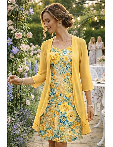 Mulheres conjunto de vestido Vestido A Line Elegante Férias Floral Gráfico Multi Camadas Imprimir Vestido midi Manga 3/4 Gola Redonda Diário Amarelo Roxo Verão Primavera Normal
