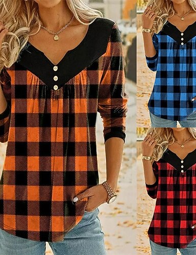 Mulheres Camisa Social Botões Âmbar Gráfico Xadrez Elegante Boêmia Vintage Manga Longa Decote V Tops regulares Diário Trabalho Para Noite Azul Vermelho Laranja Cinzento Primavera Outono Inverno