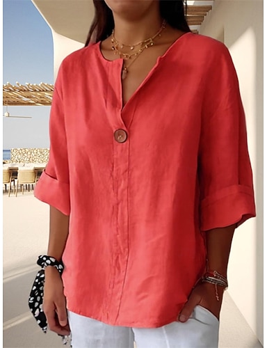 Mulheres Camisa Social Blusa Linho de algodão sintético Botões Tecido à moda Manga 3/4 Decote V Tops regulares Diário Feriado Para Noite Preto Verde Tropa Vermelho Azul Marinha Cinza Claro Verão