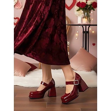 Sapatos Mary Jane vermelhos de verniz para mulheres, com detalhe de fivela – estilo vintage dos anos 50, salto bloco confortável para ocasiões formais, festas e Natal.