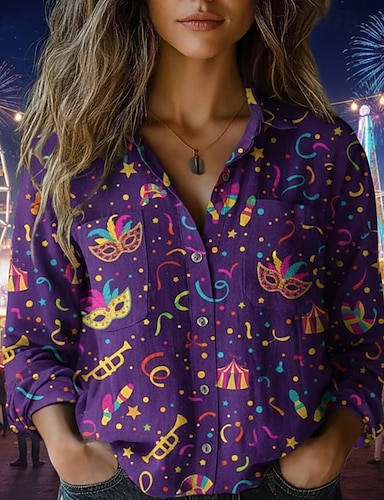Carnaval Mulheres Camisa Social camisa Boho Botões Imprimir Gráfico Vintage à moda Étnico Manga Longa Colarinho de Camisa Tops regulares Diário Feriado Para Noite Roxo Claro Roxo Violeta Primavera