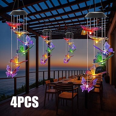 Conjunto de 4 sinos de vento solares em formato de borboleta, luzes LED suspensas para exterior, decoração à prova d'água para jardim, pátio, varanda e quintal, ideal para festas, feriados,