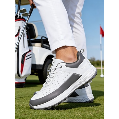 Tênis de golfe masculino branco e cinza, design leve e respirável, sola com absorção de impacto, estilo esportivo e elegante para jogadores de golfe.