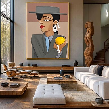 Pintura abstrata de mulher pintada à mão, em óleo, com figura de limão, pôster ou tela inspirada em arte abstrata para decoração de parede moderna e onírica.