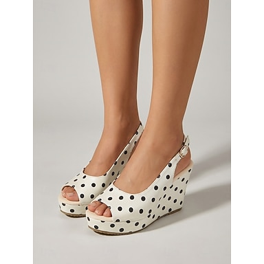 Sandálias anabela femininas retrô com estampa de bolinhas - elegantes e brancas &Sandálias pretas de plataforma com bico aberto e tira no calcanhar, perfeitas para cruzeiros de luxo e festas no