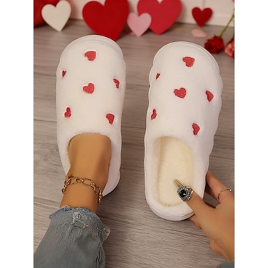 Pantufas femininas brancas de pelúcia com bordado de coração vermelho – pantufas quentinhas e macias com sola grossa, perfeitas para o quarto, Dia dos Namorados e para presentear.