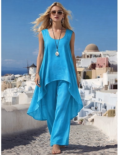 Mulheres Conjuntos de calças Bolero Linho de algodão sintético Sem Manga Gola Redonda Côr Sólida Moda Roupa de rua Casual Diário Ao ar livre Azul Verão Normal