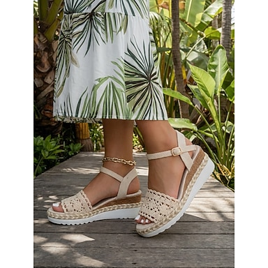 sandálias femininas de cunha em crochê bege – plataforma de alpargatas estilo boêmio com tira no tornozelo para férias de verão, caminhadas na praia e passeios casuais