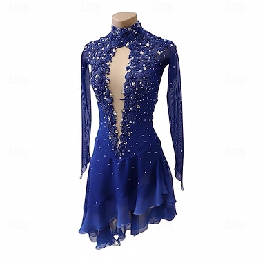 Vestidos para Patinação Artística Mulheres Patinação no Gelo Vestidos Azul Patchwork Barra Assimétrica Com Stretch Treino Competição Roupa para Patinação Clássico Cristal / Strass Sem Manga Patinação