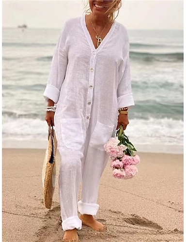 Mulheres Normal Macacão Ativo Côr Sólida Manga Longa Perna larga Decote V Bolsos Botões Diário Praia Ajuste Largo Branco Verão
