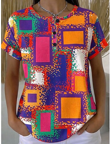 Tops Waffle Femininos Malha Texturizada Camiseta Cor Block Gráfica Tribal Estilosa Clássica Manga Curta Henley Tamanhos Regulares Diários Esportivos Laranja Verão Primavera