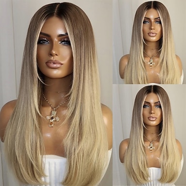 Peruca loira para mulheres, longa e ondulada, peruca loira sintética, parte intermediária, ombre, perucas loiras para festa diária