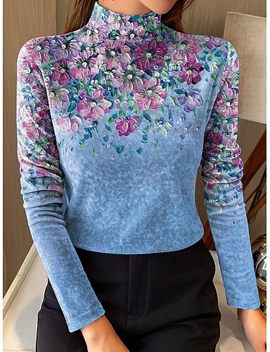 Mulheres Túnica Camisetas Imprimir Floral Gráfico Elegante Vintage Moda Manga Longa Gola Alta Tops regulares Diário Para Noite Final de semana Azul Roxo Verde Primavera