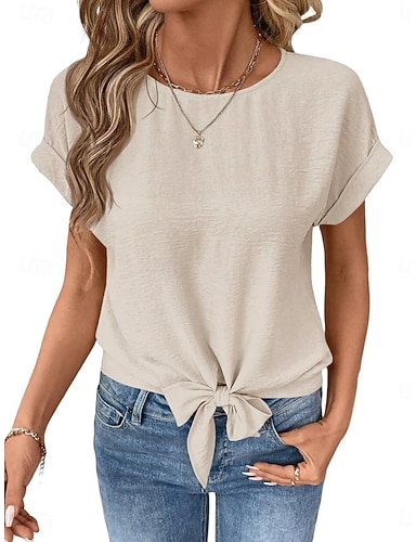 Mulheres Camiseta T-shirt Laço Tecido Moda à moda Clássico Manga Curta Gola Redonda Tops regulares Diário Para Noite Final de semana Preto Branco Vinho Marron Bege Verão Primavera
