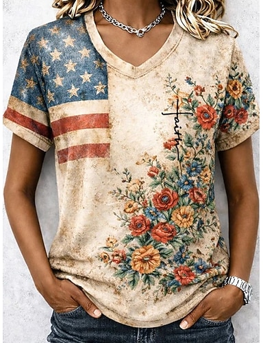 Dia da Independência Americana Mulheres Camiseta Imprimir Gráfico Bandeira Bandeira americana Vintage à moda Clássico Manga Curta Decote V Tops regulares Diário Cáqui Verão Primavera