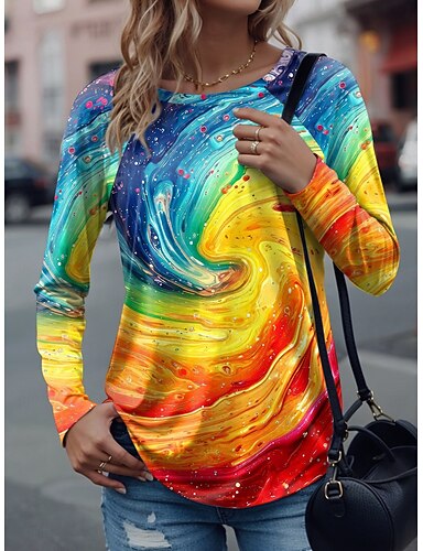 Mulheres Camiseta Imprimir Gráfico Geométrica Vintage à moda Casual Manga Longa Gola Redonda Tops regulares Diário Final de semana Amarelo Vermelho Roxo Verde Primavera Outono Inverno