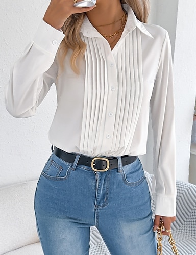 Mulheres Camisa Social camisa de botão Camisa casual Blusa Franzido Botões Tecido à moda Clássico Moderno Manga Longa Colarinho de Camisa Tops regulares Diário Feriado Para Noite Branco Verde Cáqui